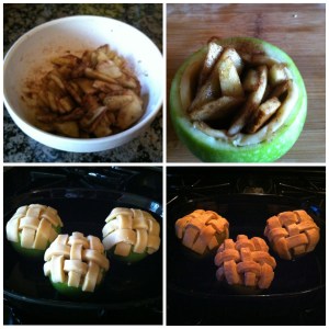 Cover the top of the apple in a lattice pattern with pie crust strips. Place apples in an 8×8 pan. If your apples are big you may need a bigger pan. Add just enough water to the cover the bottom of the pan. Cover with foil and bake for 20-25 minutes. Remove foil and bake for an additional 20 minutes or until crust is golden brown and sliced apples are soft. Serves 4.